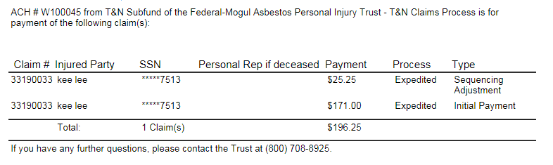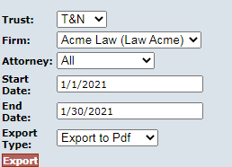 7) After selecting the Output Type, click on the Export button, a file will open with the following data: Trust, Firm Name, Attorney Last Name, Attorney First Name, Attorney Middle Initial, Claim Number, SSN (Last 4 SSN), Claimant Last Name, Claimant First Name, Claimant Middle Initial, Payment Date, Principal Amount, Sequence Adjustment and Firm File Number. Click on any of the report types below to view a sample report.